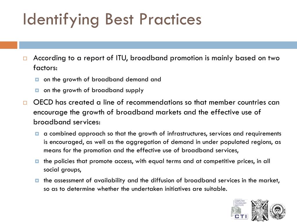 Identifying Best Practices • According to a report of ITU, broadband promotion is mainly based on two factors: • on the growth of broadband demand and • on the growth of broadband supply • OECD has created a line of recommendations so that member countries can encourage the growth of broadband markets and the effective use of broadband services: • a combined approach so that the growth of infrastructures, services and requirements is encouraged, as well as the aggregation of demand in under populated regions, as means for the promotion and the effective use of broadband services, • the policies that promote access, with equal terms and at competitive prices, in all social groups, • the assessment of availability and the diffusion of broadband services in the market, so as to determine whether the undertaken initiatives are suitable.