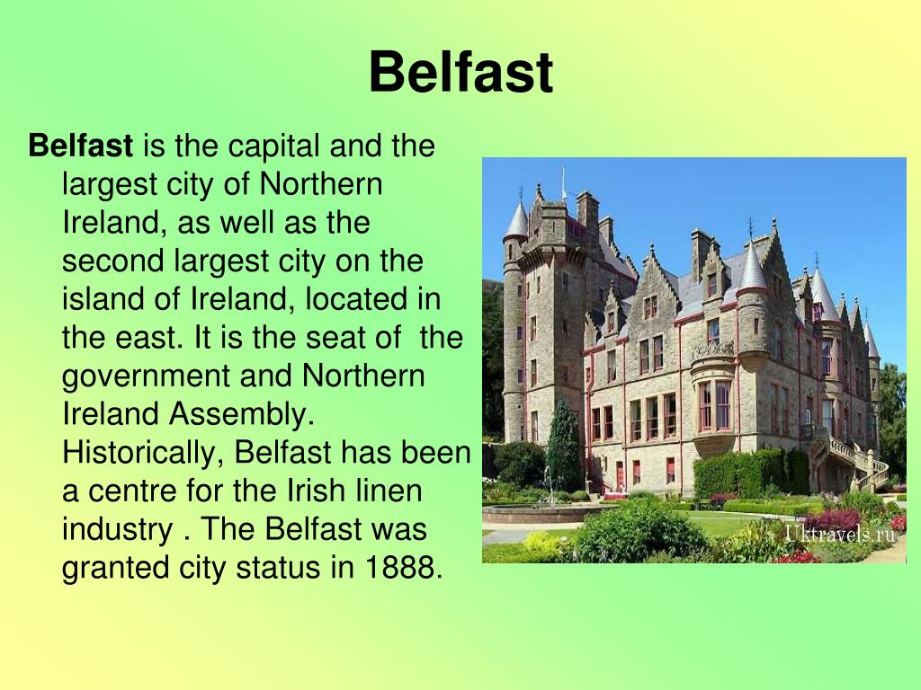 Belfast Belfast is the capital and the largest city of Northern Ireland, as well as the second largest city on the island of Ireland, located in the east. It is the seat of the government and Northern Ireland Assembly. Historically, Belfast has been a centre for the Irish linen industry . The Belfast was granted city status in 1888.