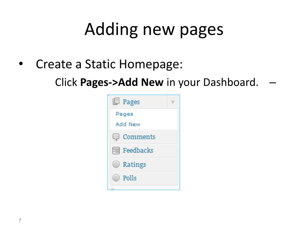 Adding new pages • Create a Static Homepage: • Click Pages->Add New in your Dashboard.