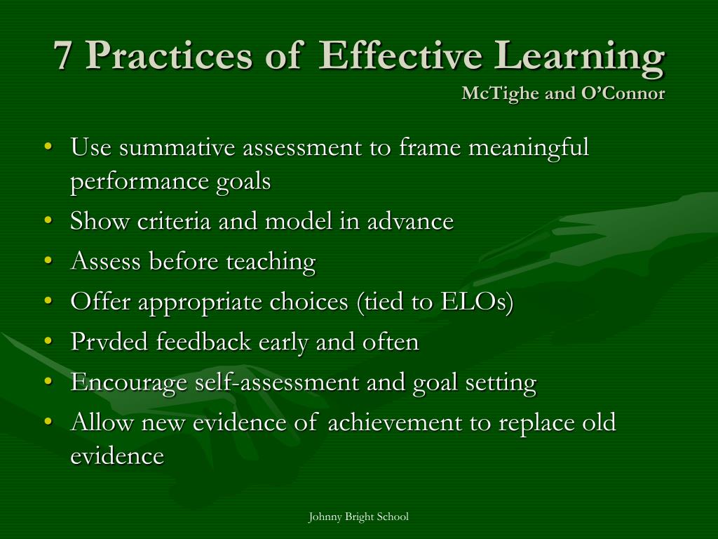 7 Practices of Effective LearningMcTighe and O’Connor • Use summative assessment to frame meaningful performance goals • Show criteria and model in advance • Assess before teaching • Offer appropriate choices (tied to ELOs) • Prvded feedback early and often • Encourage self-assessment and goal setting • Allow new evidence of achievement to replace old evidence Johnny Bright School