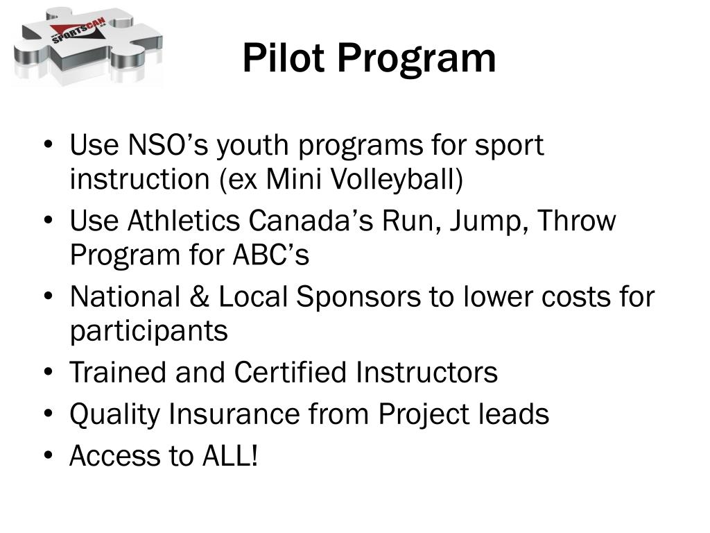 Pilot Program • Use NSO’s youth programs for sport instruction (ex Mini Volleyball) • Use Athletics Canada’s Run, Jump, Throw Program for ABC’s • National & Local Sponsors to lower costs for participants • Trained and Certified Instructors • Quality Insurance from Project leads • Access to ALL!