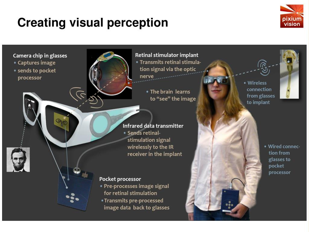 Restoringfunctionalsight to blind patients • Patients willbe able to recognizefamiliar people • Patients willbe able to recognize the shape of, identify and grasplargerobjects • Patients willbe able to orient themselveseven in an unfamiliarsurroundings • Patients willbe able to live with more autonomy and mobility Before After