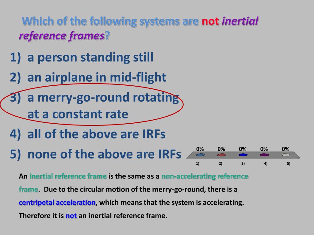Which of the following systems are notinertial reference frames? • a person standing still • an airplane in mid-flight • a merry-go-round rotating at a constant rate • all of the above are IRFs • none of the above are IRFs Aninertial reference frameis the same as anon-accelerating reference frame. Due to the circular motion of the merry-go-round, there is acentripetal acceleration, which means that the system is accelerating. Therefore it isnotan inertial reference frame.