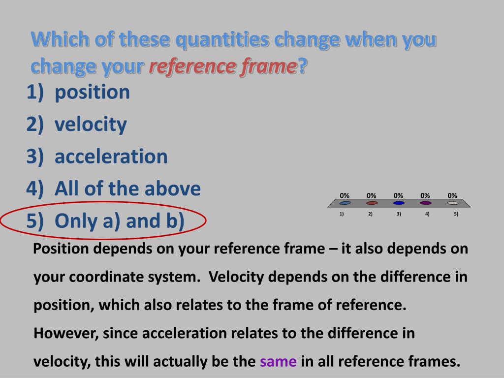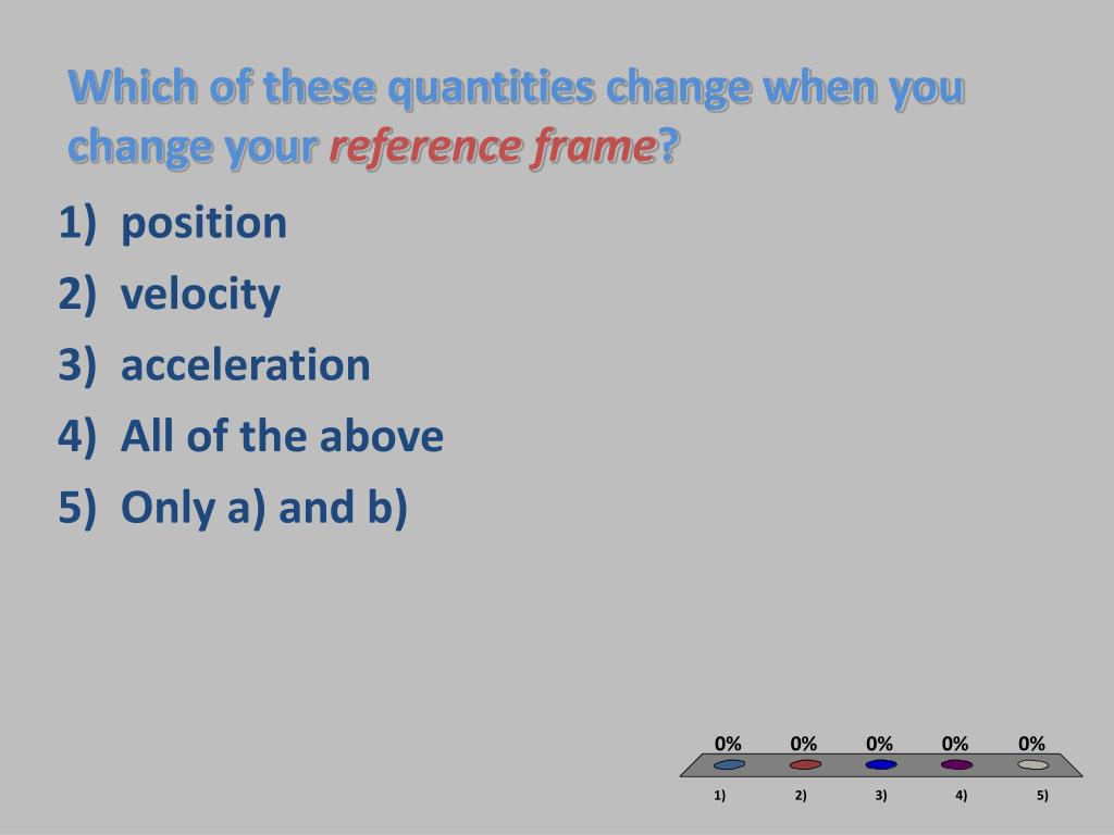 Which of these quantities change when you change your reference frame? • position • velocity • acceleration • All of the above • Only a) and b)