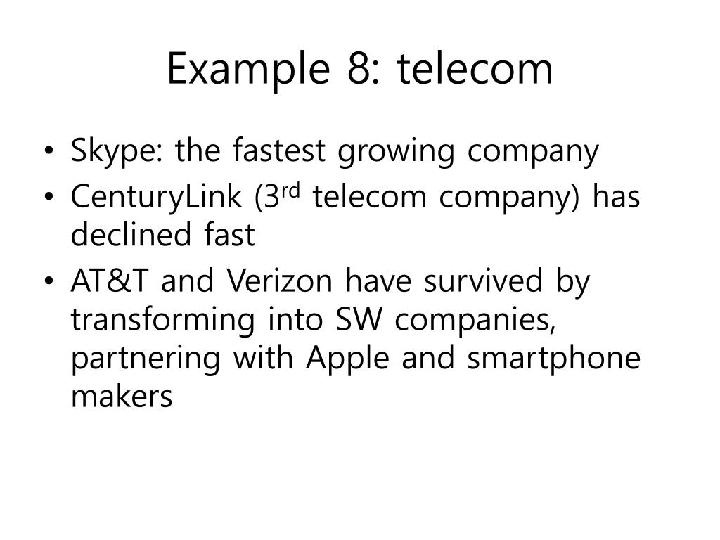 Example 8: telecom • Skype: the fastest growing company • CenturyLink (3rd telecom company) has declined fast • AT&T and Verizon have survived by transforming into SW companies, partnering with Apple and smartphone makers