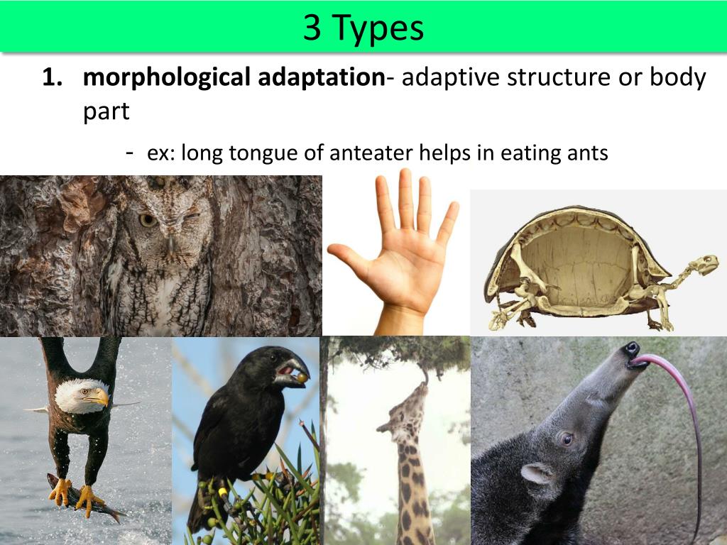 3 Types • morphological adaptation- adaptive structure or body part - ex: long tongue of anteater helps in eating ants