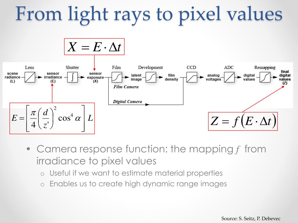 From light rays to pixel values • Camera response function: the mapping f from irradiance to pixel values • Useful if we want to estimate material properties • Enables us to create high dynamic range images Source: S. Seitz, P. Debevec