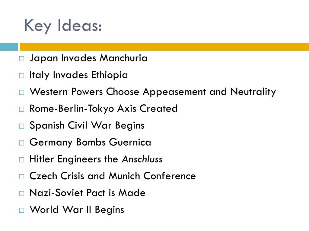 Key Ideas: • Japan Invades Manchuria • Italy Invades Ethiopia • Western Powers Choose Appeasement and Neutrality • Rome-Berlin-Tokyo Axis Created • Spanish Civil War Begins • Germany Bombs Guernica • Hitler Engineers the Anschluss • Czech Crisis and Munich Conference • Nazi-Soviet Pact is Made • World War II Begins