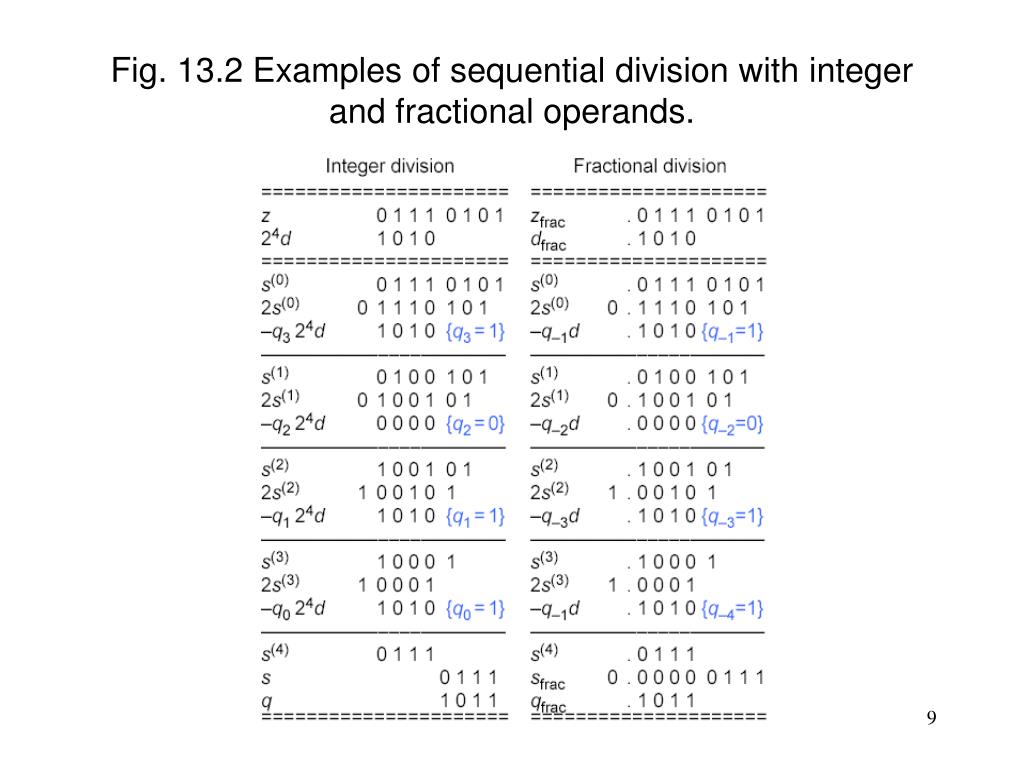 Fig. 13.2 Examples of sequential division with integer and fractional operands.