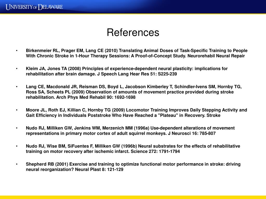 References • Birkenmeier RL, Prager EM, Lang CE (2010) Translating Animal Doses of Task-Specific Training to People With Chronic Stroke in 1-Hour Therapy Sessions: A Proof-of-Concept Study. Neurorehabil Neural Repair • Kleim JA, Jones TA (2008) Principles of experience-dependent neural plasticity: implications for rehabilitation after brain damage. J Speech Lang Hear Res 51: S225-239 • Lang CE, Macdonald JR, Reisman DS, Boyd L, Jacobson Kimberley T, Schindler-Ivens SM, Hornby TG, Ross SA, Scheets PL (2009) Observation of amounts of movement practice provided during stroke rehabilitation. Arch Phys Med Rehabil 90: 1692-1698 • Moore JL, Roth EJ, Killian C, Hornby TG (2009) Locomotor Training Improves Daily Stepping Activity and Gait Efficiency in Individuals Poststroke Who Have Reached a "Plateau" in Recovery. Stroke • Nudo RJ, Milliken GW, Jenkins WM, Merzenich MM (1996a) Use-dependent alterations of movement representations in primary motor cortex of adult squirrel monkeys. J Neurosci 16: 785-807 • Nudo RJ, Wise BM, SiFuentes F, Milliken GW (1996b) Neural substrates for the effects of rehabilitative training on motor recovery after ischemic infarct. Science 272: 1791-1794 • Shepherd RB (2001) Exercise and training to optimize functional motor performance in stroke: driving neural reorganization? Neural Plast 8: 121-129