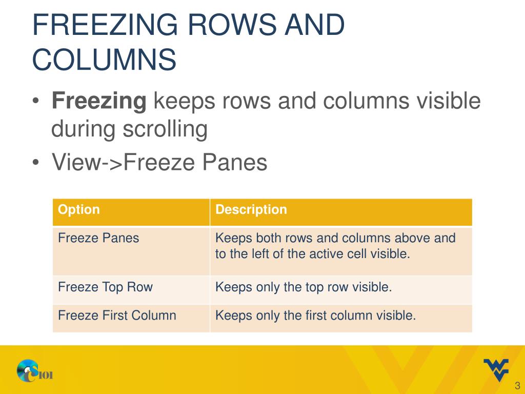 Day 9: Excel Chapter 5. Tazin Afrin Tazin.Afrin@mail.wvu.edu February 06, 2014. Objectives. Freeze rows and columns Print large datasets Understand table design Create a table Apply a table style Sort data. Freezing rows and columns.