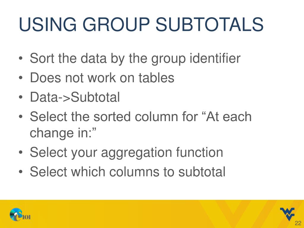 Using group subtotals • Sort the data by the group identifier • Does not work on tables • Data->Subtotal • Select the sorted column for “At each change in:” • Select your aggregation function • Select which columns to subtotal