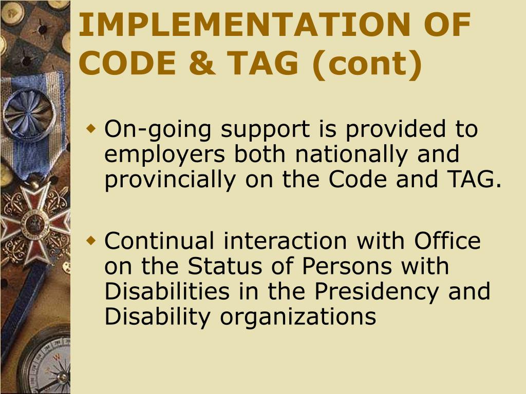 IMPLEMENTATION OF CODE & TAG (cont) • On-going support is provided to employers both nationally and provincially on the Code and TAG. • Continual interaction with Office on the Status of Persons with Disabilities in the Presidency and Disability organizations