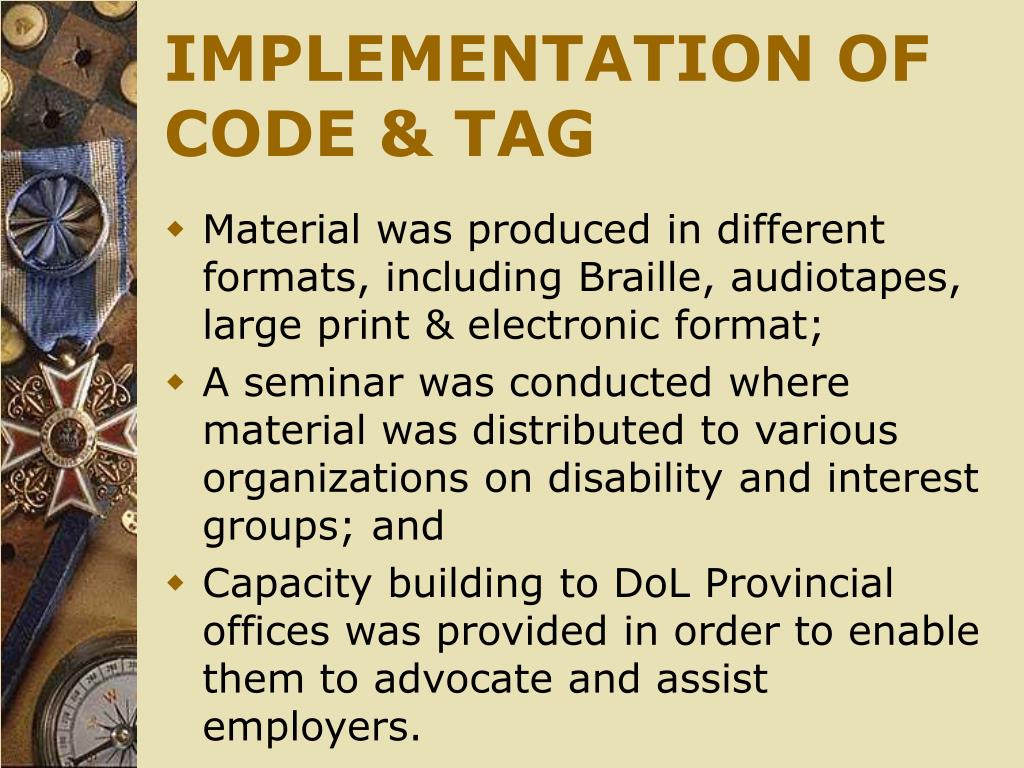 IMPLEMENTATION OF CODE & TAG • Material was produced in different formats, including Braille, audiotapes, large print & electronic format; • A seminar was conducted where material was distributed to various organizations on disability and interest groups; and • Capacity building to DoL Provincial offices was provided in order to enable them to advocate and assist employers.