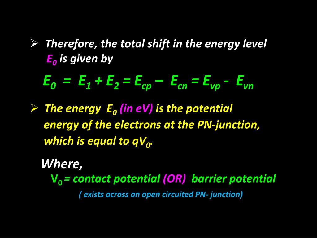 Therefore, the total shift in the energy level • E0 is given by E0 = E1 + E2 = Ecp – Ecn = Evp - Evn • The energy E0(in eV) is the potential • energy of the electrons at the PN-junction, • which is equal to qV0. Where, V0= contact potential (OR) barrier potential ( exists across an open circuited PN- junction)