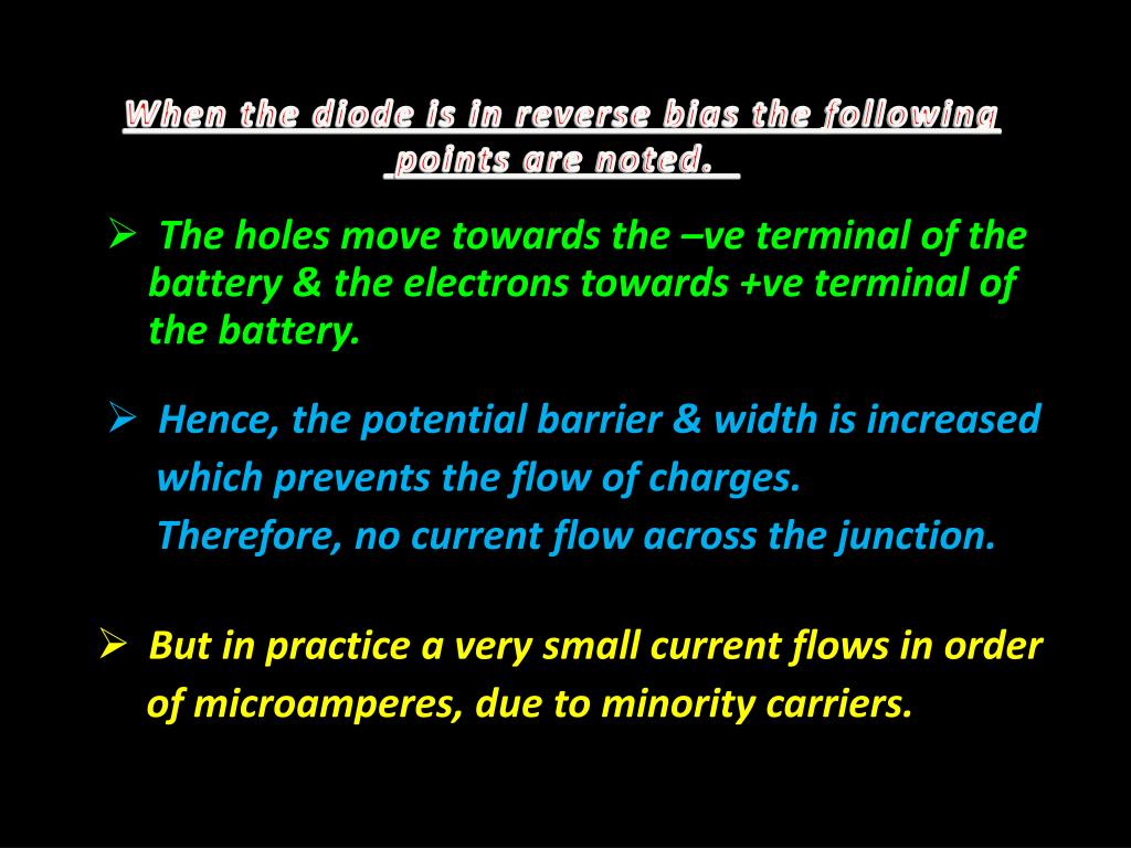When the diode is in reverse bias the following points are noted. • The holes move towards the –ve terminal of the battery & the electrons towards +ve terminal of the battery. • Hence, the potential barrier & width is increased • which prevents the flow of charges. • Therefore, no current flow across the junction. • But in practice a very small current flows in order • of microamperes, due to minority carriers.