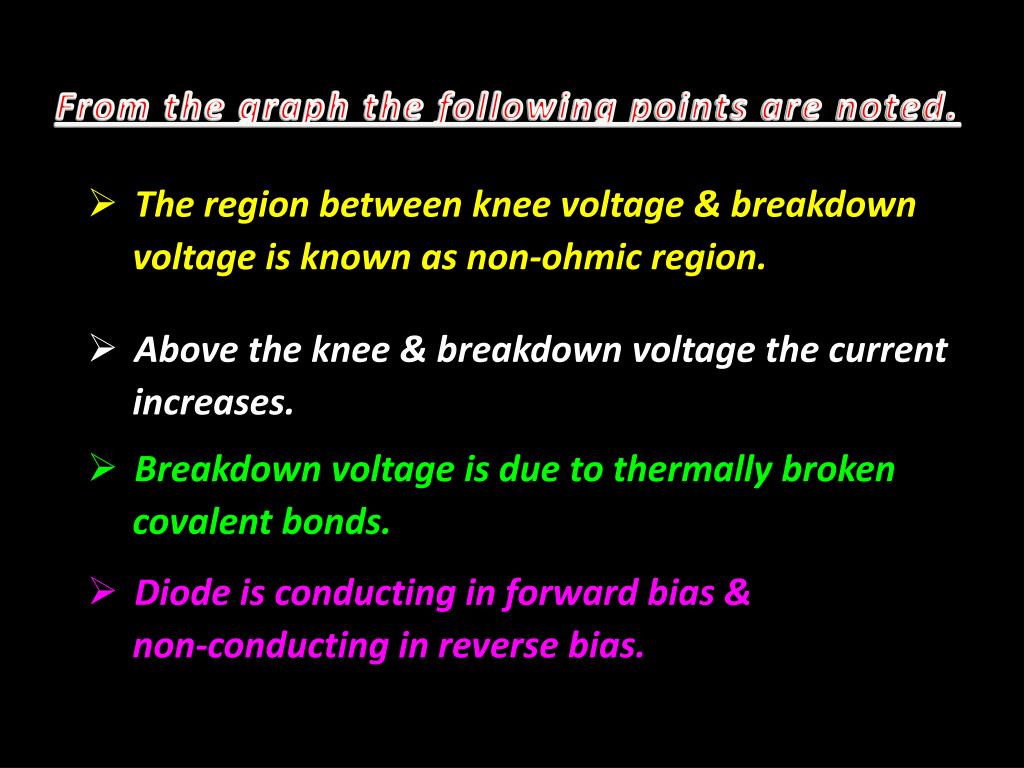 From the graph the following points are noted. • The region between knee voltage & breakdown • voltage is known as non-ohmic region. • Above the knee & breakdown voltage the current • increases. • Breakdown voltage is due to thermally broken • covalent bonds. • Diode is conducting in forward bias & • non-conducting in reverse bias.