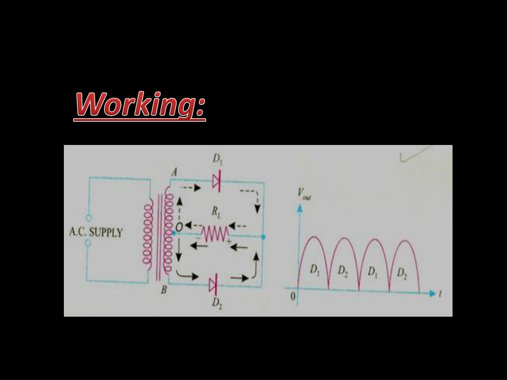 During the +ve half cycle of input,end A • becomes +ve & B becomes negative. This • makes the diode D1 in forward biased & • D2 in reverse biased.Therefore, D1 • conducts while D2 does not conduct. • During the -ve half cycle of input,end A • becomes -ve & B becomes positive. This • makes the diode D2 in forward biased & • D1 in reverse biased.Therefore, D2 • conducts while D1 does not conduct.