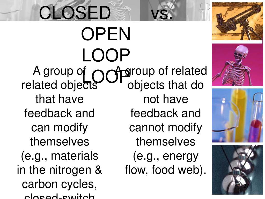 CLOSED vs. OPENLOOP LOOP A group of related objects that have feedback and can modify themselves (e.g., materials in the nitrogen & carbon cycles, closed-switch systems. • A group of related objects that do not have feedback and cannot modify themselves (e.g., energy flow, food web).