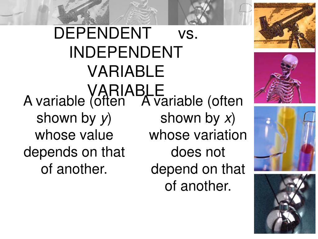 DEPENDENT vs. INDEPENDENTVARIABLE VARIABLE A variable (often shown by y) whose value depends on that of another. • A variable (often shown by x) whose variation does not depend on that of another.