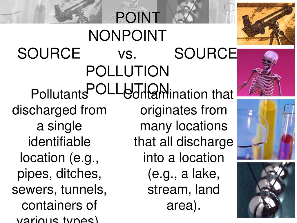 POINT NONPOINTSOURCE vs. SOURCEPOLLUTION POLLUTION Pollutants discharged from a single identifiable location (e.g., pipes, ditches, sewers, tunnels, containers of various types). • Contamination that originates from many locations that all discharge into a location (e.g., a lake, stream, land area).