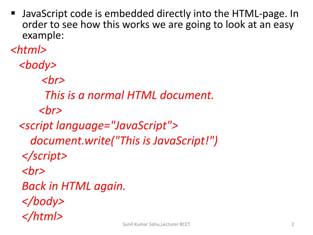 JavaScript code is embedded directly into the HTML-page. In order to see how this works we are going to look at an easy example: <html> <body> <br> This is a normal HTML document. <br> <script language="JavaScript"> document.write("This is JavaScript!") </script> <br> Back in HTML again. </body> </html> Sunil Kumar Sahu,Lecturer RCET
