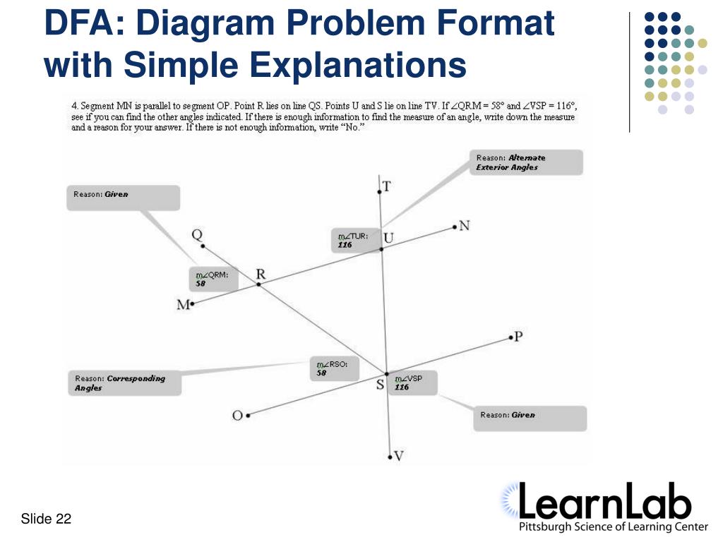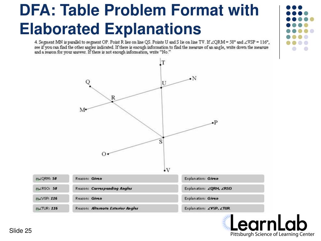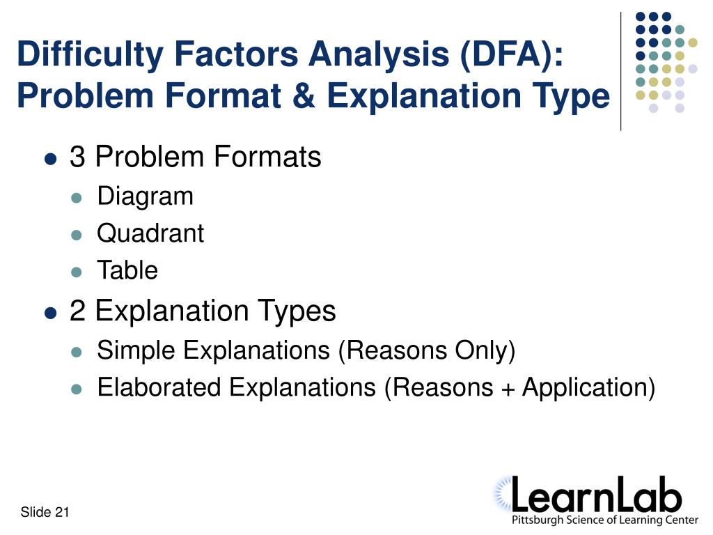 Difficulty Factors Analysis (DFA): Problem Format & Explanation Type • 3 Problem Formats • Diagram • Quadrant • Table • 2 Explanation Types • Simple Explanations (Reasons Only) • Elaborated Explanations (Reasons + Application)