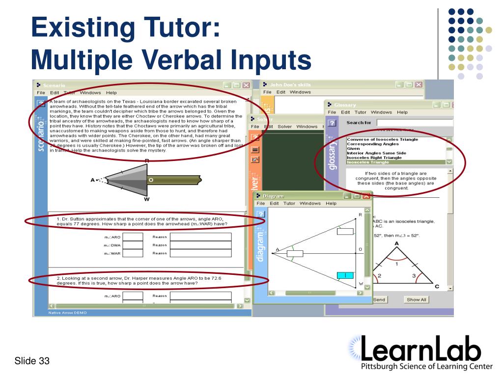 Connections to PSLC Theory • What are the relevant knowledge components? • (Verbal) Geometry principles. • E.g., Inscribed Angle Theorem means that the measure of the angle is half the measure of the intercepted arc. • (Visual) Geometry elements. • E.g., Recognizing angles, arcs, and their relationships. • (Integrated) Geometry inferences • E.g., Recognizing that an arc, which is associated with a known (or found) inscribed angle, can be found via the Inscribed Angle Theorem