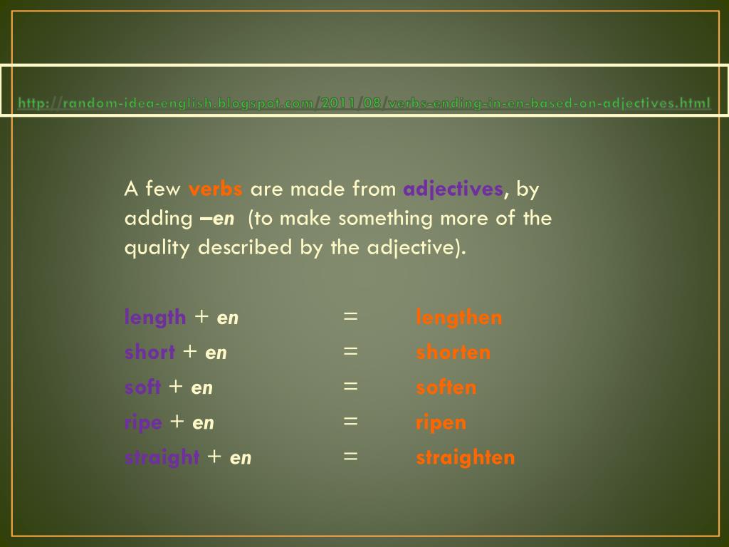 http://random-idea-english.blogspot.com/2011/08/verbs-ending-in-en-based-on-adjectives.htmlhttp://random-idea-english.blogspot.com/2011/08/verbs-ending-in-en-based-on-adjectives.html A few verbs are made from adjectives, by adding –en (to make something more of the quality described by the adjective). length + en = lengthen short + en = shorten soft + en = soften ripe + en = ripen straight + en = straighten