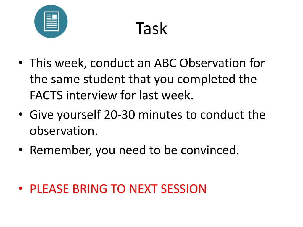 Task • This week, conduct an ABC Observation for the same student that you completed the FACTS interview for last week. • Give yourself 20-30 minutes to conduct the observation. • Remember, you need to be convinced. • PLEASE BRING TO NEXT SESSION