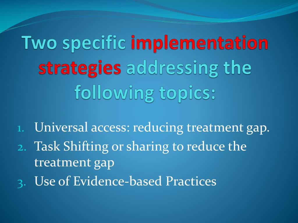 Two specific implementation strategies addressing the following topics: Universal access: reducing treatment gap. Task Shifting or sharing to reduce the treatment gap Use of Evidence-based Practices