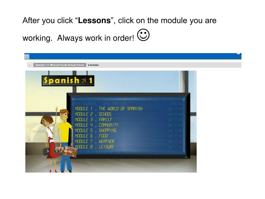 After you click “Lessons”, click on the module you are working. Always work in order!