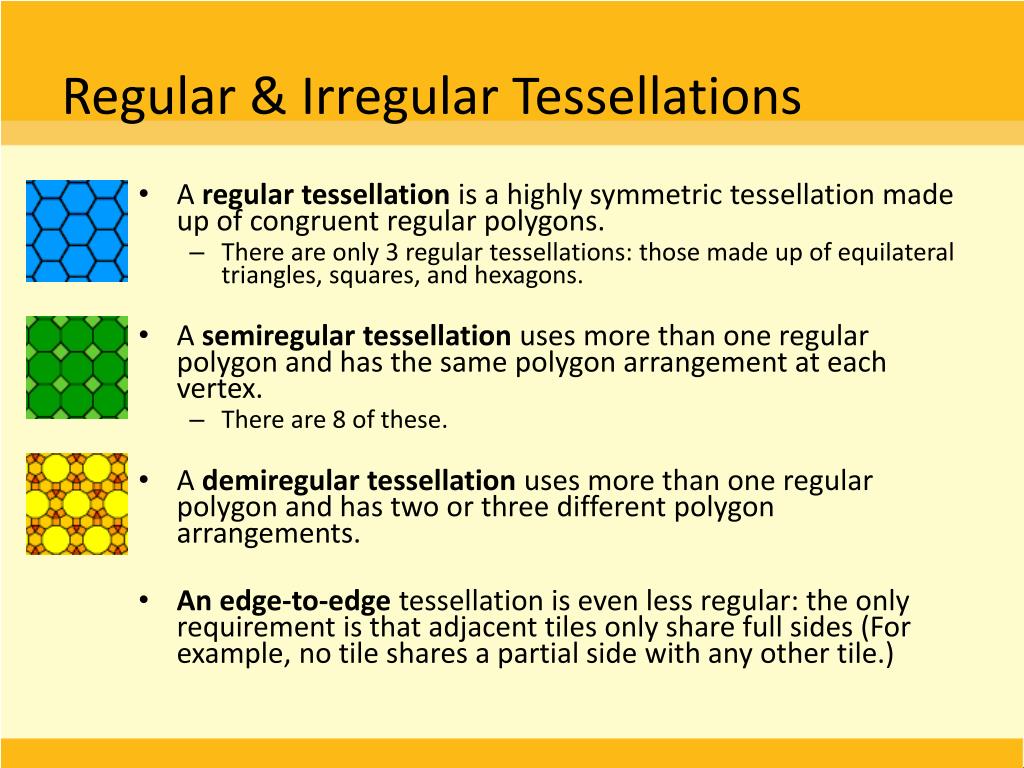 Regular & Irregular Tessellations • A regular tessellation is a highly symmetric tessellation made up of congruent regular polygons. • There are only 3 regular tessellations: those made up of equilateral triangles, squares, and hexagons. • A semiregular tessellation uses more than one regular polygon and has the same polygon arrangement at each vertex. • There are 8 of these. • A demiregular tessellation uses more than one regular polygon and has two or three different polygon arrangements. • An edge-to-edge tessellation is even less regular: the only requirement is that adjacent tiles only share full sides (For example, no tile shares a partial side with any other tile.)