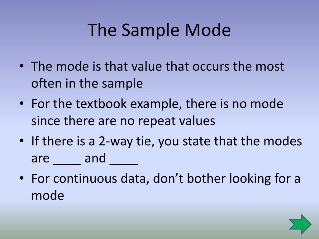 The Sample Mode • The mode is that value that occurs the most often in the sample • For the textbook example, there is no mode since there are no repeat values • If there is a 2-way tie, you state that the modes are ____ and ____ • For continuous data, don’t bother looking for a mode