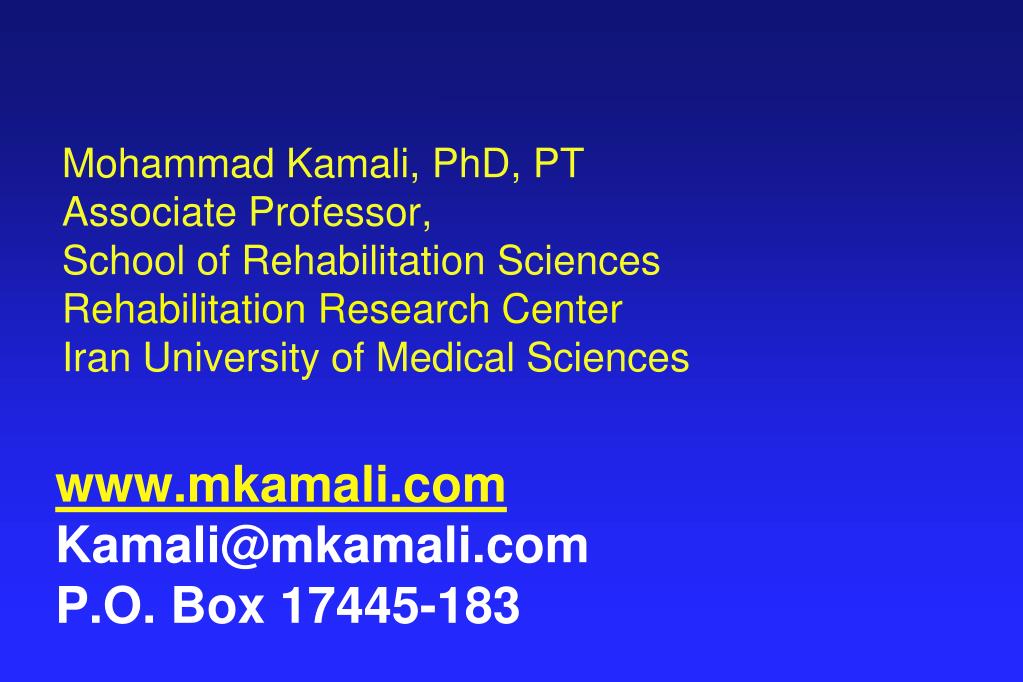 Mohammad Kamali, PhD, PTAssociate Professor,School of Rehabilitation SciencesRehabilitation Research CenterIran University of Medical Sciences www.mkamali.com Kamali@mkamali.com P.O. Box 17445-183