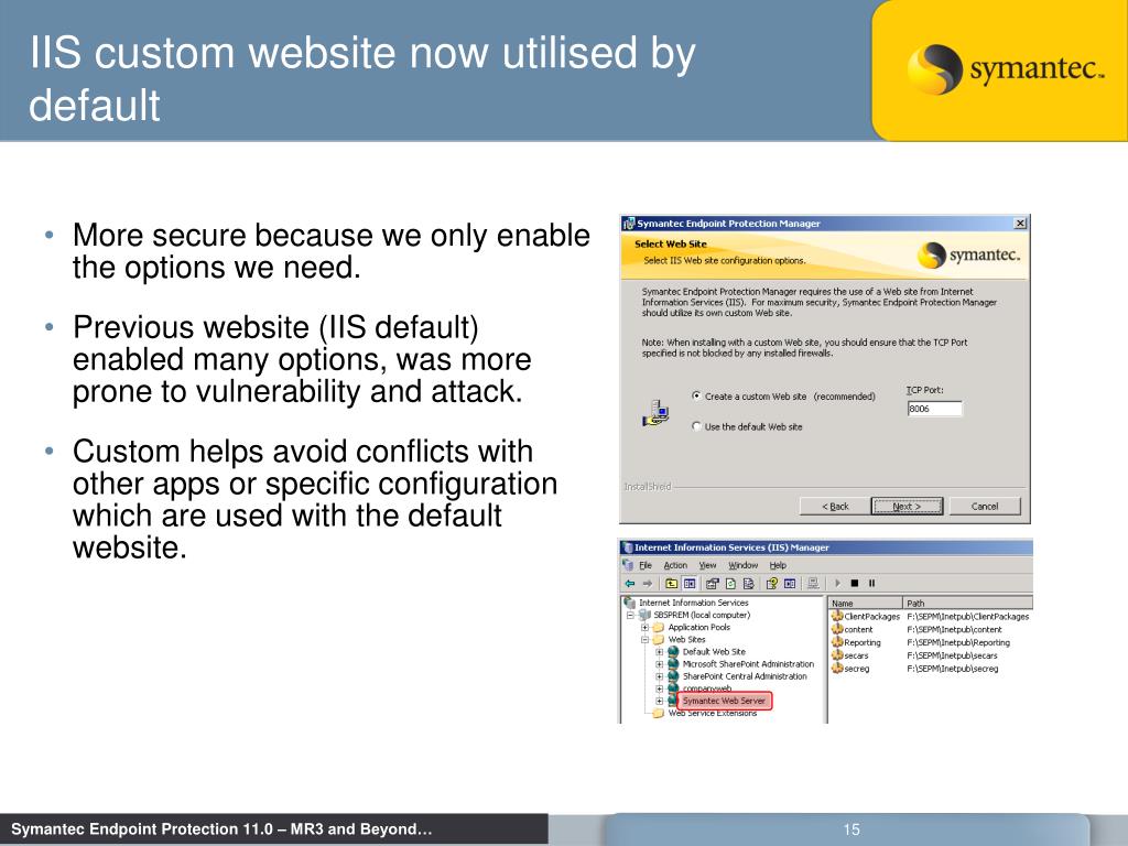 IIS custom website now utilised by default • More secure because we only enable the options we need. • Previous website (IIS default) enabled many options, was more prone to vulnerability and attack. • Custom helps avoid conflicts with other apps or specific configuration which are used with the default website. Symantec Endpoint Protection 11.0 – MR3 and Beyond…