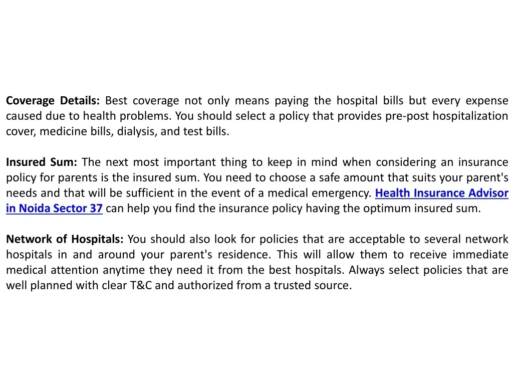 Coverage Details: Best coverage not only means paying the hospital bills but every expense caused due to health problems. You should select a policy that provides pre-post hospitalization cover, medicine bills, dialysis, and test bills. Insured Sum: The next most important thing to keep in mind when considering an insurance policy for parents is the insured sum. You need to choose a safe amount that suits your parent's needs and that will be sufficient in the event of a medical emergency. Health Insurance Advisor in Noida Sector 37 can help you find the insurance policy having the optimum insured sum. Network of Hospitals: You should also look for policies that are acceptable to several network hospitals in and around your parent's residence. This will allow them to receive immediate medical attention anytime they need it from the best hospitals. Always select policies that are well planned with clear T&C and authorized from a trusted source.