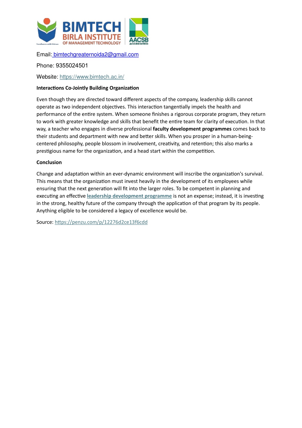 2. Email: bimtechgreaternoida2@gmail.com Phone: 9355024501 Website: https://www.bimtech.ac.in/ Interactions Co-Jointly Building Organization Even though they are directed toward different aspects of the company, leadership skills cannot operate as two independent objectives. This interaction tangentially impels the health and performance of the entire system. When someone finishes a rigorous corporate program, they return to work with greater knowledge and skills that benefit the entire team for clarity of execution. In that way, a teacher who engages in diverse professional faculty development programmescomes back to their students and department with new and better skills. When you prosper in a human-being- centered philosophy, people blossom in involvement, creativity, and retention; this also marks a prestigious name for the organization, and a head start within the competition. Conclusion Change and adaptation within an ever-dynamic environment will inscribe the organization's survival. This means that the organization must invest heavily in the development of its employees while ensuring that the next generation will fit into the larger roles. To be competent in planning and executing an effective leadership development programme is not an expense; instead, it is investing in the strong, healthy future of the company through the application of that program by its people. Anything eligible to be considered a legacy of excellence would be. Source: https://penzu.com/p/12276d2ce13f6cdd