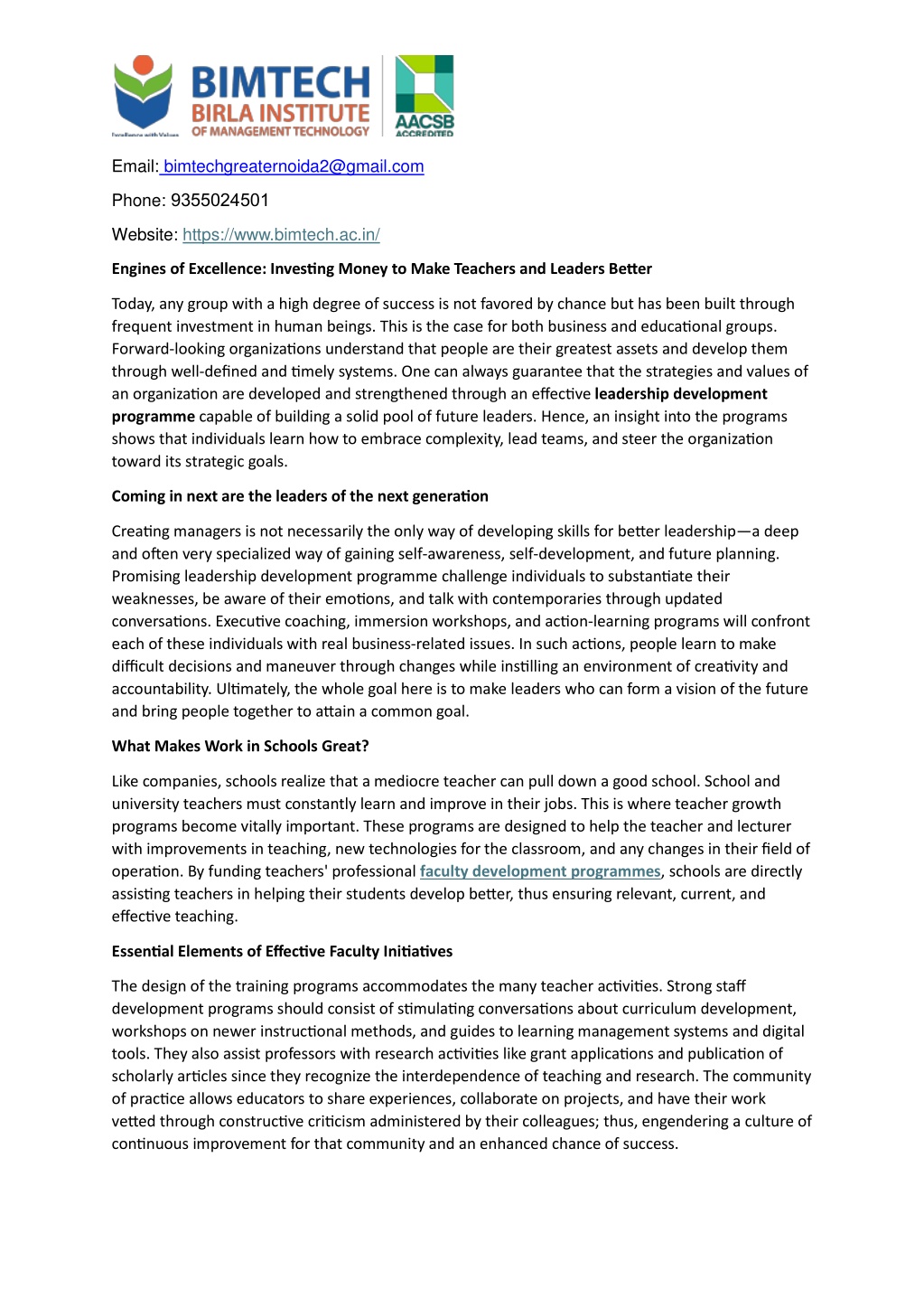 1. Email: bimtechgreaternoida2@gmail.com Phone: 9355024501 Website: https://www.bimtech.ac.in/ Engines of Excellence: Investing Money to Make Teachers and Leaders Better Today, any group with a high degree of success is not favored by chance but has been built through frequent investment in human beings. This is the case for both business and educational groups. Forward-looking organizations understand that people are their greatest assets and develop them through well-defined and timely systems. One can always guarantee that the strategies and values of an organization are developed and strengthened through an effective leadership development programme capable of building a solid pool of future leaders. Hence, an insight into the programs shows that individuals learn how to embrace complexity, lead teams, and steer the organization toward its strategic goals. Coming in next are the leaders of the next generation Creating managers is not necessarily the only way of developing skills for better leadership—a deep and often very specialized way of gaining self-awareness, self-development, and future planning. Promising leadership development programme challenge individuals to substantiate their weaknesses, be aware of their emotions, and talk with contemporaries through updated conversations. Executive coaching, immersion workshops, and action-learning programs will confront each of these individuals with real business-related issues. In such actions, people learn to make difficult decisions and maneuver through changes while instilling an environment of creativity and accountability. Ultimately, the whole goal here is to make leaders who can form a vision of the future and bring people together to attain a common goal. What Makes Work in Schools Great? Like companies, schools realize that a mediocre teacher can pull down a good school. School and university teachers must constantly learn and improve in their jobs. This is where teacher growth programs become vitally important. These programs are designed to help the teacher and lecturer with improvements in teaching, new technologies for the classroom, and any changes in their field of operation. By funding teachers' professional faculty development programmes, schools are directly assisting teachers in helping their students develop better, thus ensuring relevant, current, and effective teaching. Essential Elements of Effective Faculty Initiatives The design of the training programs accommodates the many teacher activities. Strong staff development programs should consist of stimulating conversations about curriculum development, workshops on newer instructional methods, and guides to learning management systems and digital tools. They also assist professors with research activities like grant applications and publication of scholarly articles since they recognize the interdependence of teaching and research. The community of practice allows educators to share experiences, collaborate on projects, and have their work vetted through constructive criticism administered by their colleagues; thus, engendering a culture of continuous improvement for that community and an enhanced chance of success.