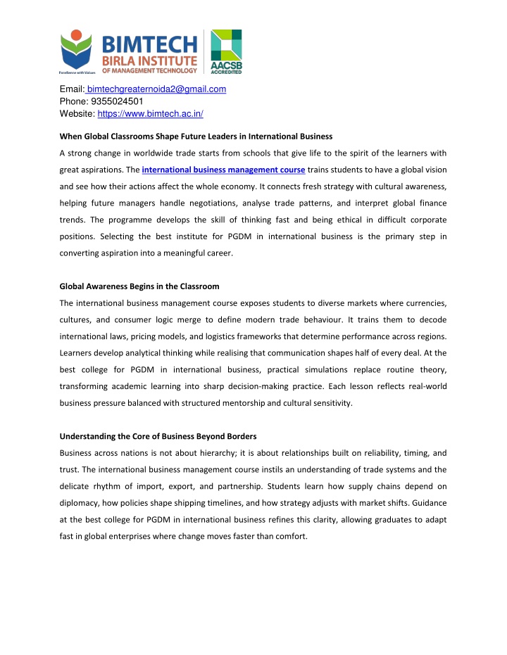 3. Email: bimtechgreaternoida2@gmail.com Phone: 9355024501 Website: https://www.bimtech.ac.in/ Building Leadership That Feels Authentic Leadership is not about command, it is about direction delivered through steady vision and clarity during uncertainty. The international business management course nurtures emotional strength to make precise choices under pressure. It trains aspirants to evaluate markets objectively while staying compassionate toward employees affected by adjustments. The best college for PGDM in international business provides an environment where future managers combine confidence with empathy. Decision- making thus shifts from mechanical accuracy to responsible awareness that sustains every organisation through fluctuation and reform. Leadership growth path: 1.Self-assessment through guided reflection workshops. 2.Mentorship programs connecting students with senior business heads. 3.Training modules emphasising ethical leadership behaviour. Conclusion In a world reshaped by changing trade relations and emerging economic centres, the international business management course stands as a preparation for meaningful leadership. It reshapes thinking patterns and trains the mind to recognise opportunities through insight rather than guesswork. Enrollment in the best college for PGDM in international business becomes more than education; it is an investment in clarity and ethical integrity. Those graduating carry with them the quiet confidence of global fluency built by reason and purpose. Source:https://logcla.com/blogs/1061852/When-Global-Classrooms-Shape-Future-Leaders-in- International-Business