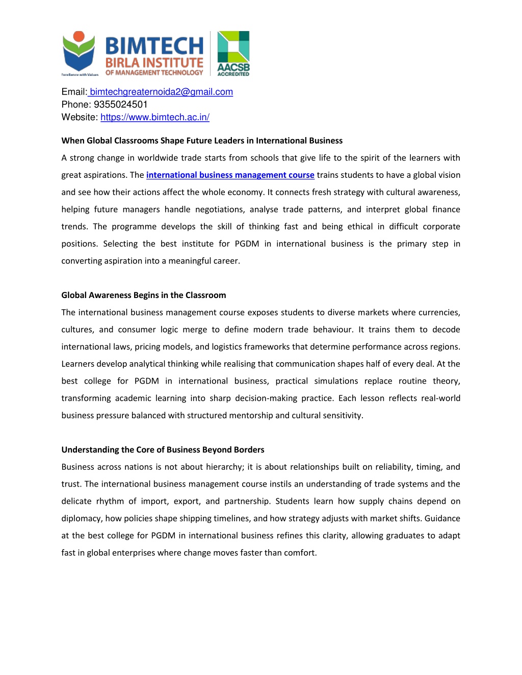 1. Email: bimtechgreaternoida2@gmail.com Phone: 9355024501 Website: https://www.bimtech.ac.in/ When Global Classrooms Shape Future Leaders in International Business A strong change in worldwide trade starts from schools that give life to the spirit of the learners with great aspirations. The international business management course trains students to have a global vision and see how their actions affect the whole economy. It connects fresh strategy with cultural awareness, helping future managers handle negotiations, analyse trade patterns, and interpret global finance trends. The programme develops the skill of thinking fast and being ethical in difficult corporate positions. Selecting the best institute for PGDM in international business is the primary step in converting aspiration into a meaningful career. Global Awareness Begins in the Classroom The international business management course exposes students to diverse markets where currencies, cultures, and consumer logic merge to define modern trade behaviour. It trains them to decode international laws, pricing models, and logistics frameworks that determine performance across regions. Learners develop analytical thinking while realising that communication shapes half of every deal. At the best college for PGDM in international business, practical simulations replace routine theory, transforming academic learning into sharp decision-making practice. Each lesson reflects real-world business pressure balanced with structured mentorship and cultural sensitivity. Understanding the Core of Business Beyond Borders Business across nations is not about hierarchy; it is about relationships built on reliability, timing, and trust. The international business management course instils an understanding of trade systems and the delicate rhythm of import, export, and partnership. Students learn how supply chains depend on diplomacy, how policies shape shipping timelines, and how strategy adjusts with market shifts. Guidance at the best college for PGDM in international business refines this clarity, allowing graduates to adapt fast in global enterprises where change moves faster than comfort.