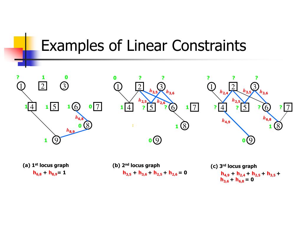 0 ? ? ? ? ? 1 2 3 1 2 3 h3,5 h3,5 h3,6 h2,4 h3,6 h2,5 h2,5 h2,6 1 ? 1 ? ? ? ? ? 4 5 6 7 4 5 6 7 h6,8 h4,9 : 8 8 1 1 0 0 9 9 (b) 2nd locus graph h3,5 + h3,6 + h2,5 + h2,6 = 0 (c) 3rd locus graph h4,9 + h2,4 + h2,5 + h3,5 + h3,6 + h6,8 = 0 Examples of Linear Constraints ? 1 0 1 2 3 1 1 0 1 4 5 6 7 h6,8 8 0 h8,9 1 9 (a) 1st locus graph h6,8 + h8,9= 1
