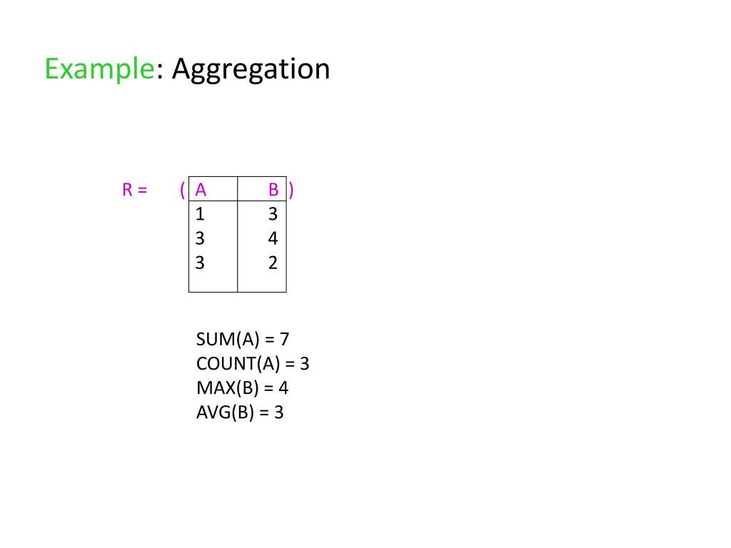 Example: Aggregation R = ( A B ) 1 3 3 4 3 2 SUM(A) = 7 COUNT(A) = 3 MAX(B) = 4 AVG(B) = 3