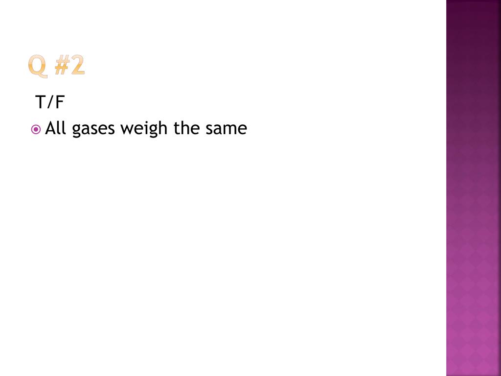 Q #2 T/F • All gases weigh the same No, experiment yesterday proved that they do not weigh the same. Gases have different density/mass