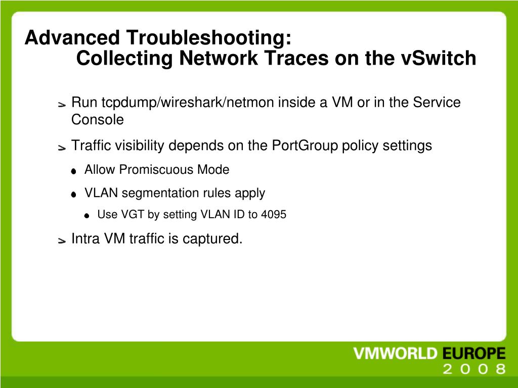 Advanced Troubleshooting: Collecting Network Traces on the vSwitch • Run tcpdump/wireshark/netmon inside a VM or in the Service Console • Traffic visibility depends on the PortGroup policy settings • Allow Promiscuous Mode • VLAN segmentation rules apply • Use VGT by setting VLAN ID to 4095 • Intra VM traffic is captured.