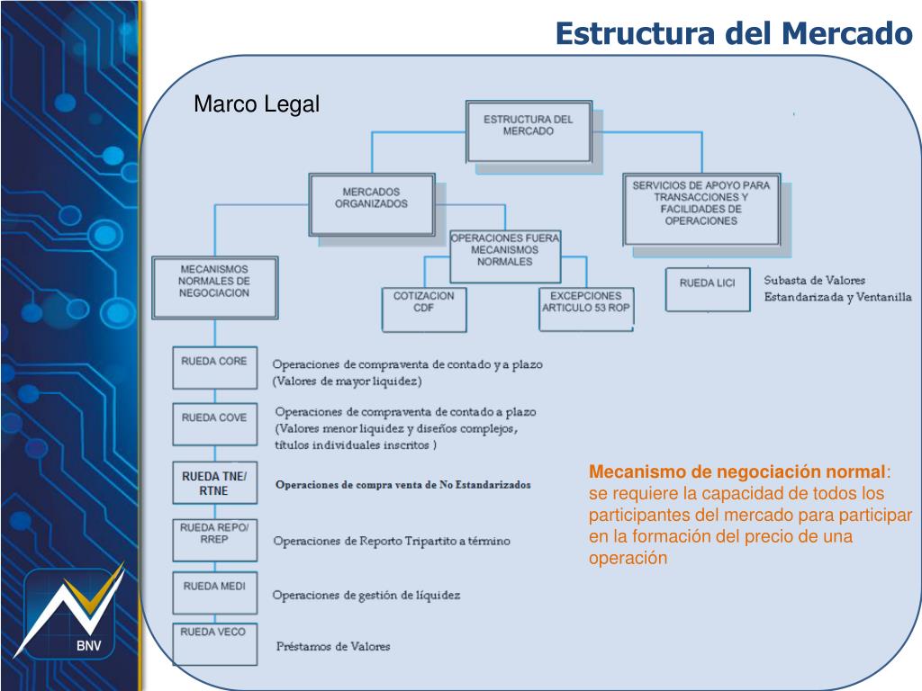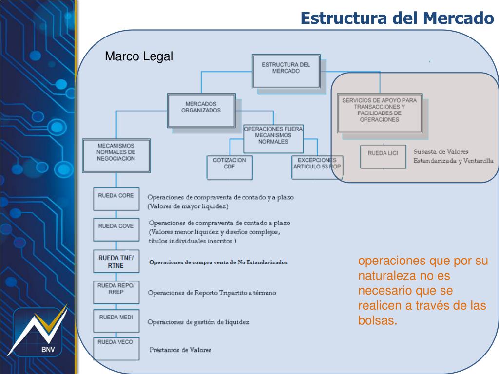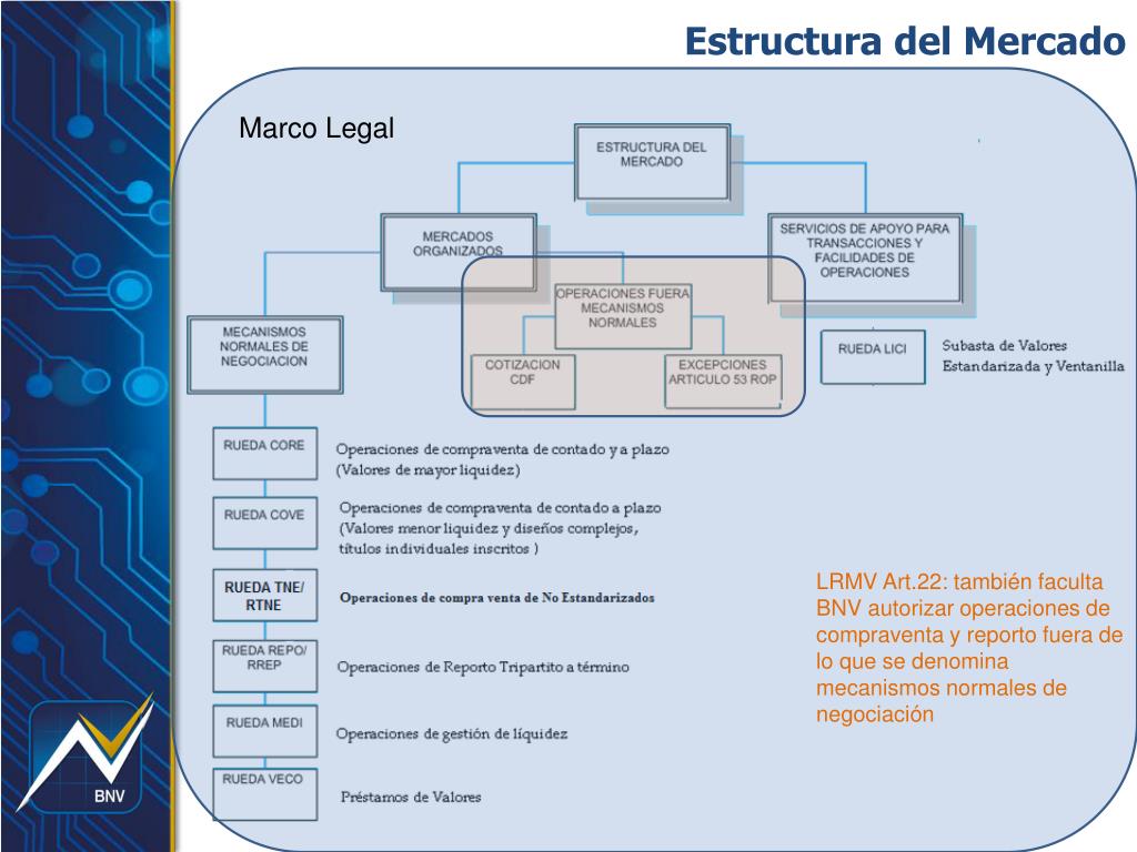 Estructura del Mercado Marco Legal LRMV Art.22: también faculta BNV autorizar operaciones de compraventa y reporto fuera de lo que se denomina mecanismos normales de negociación