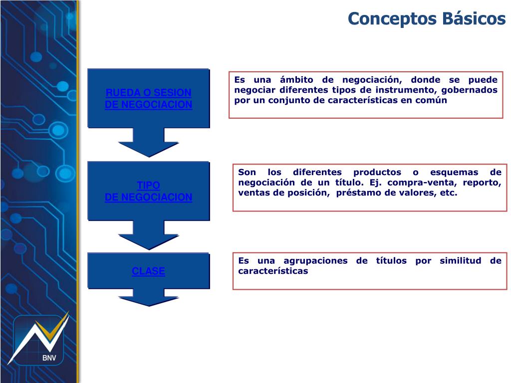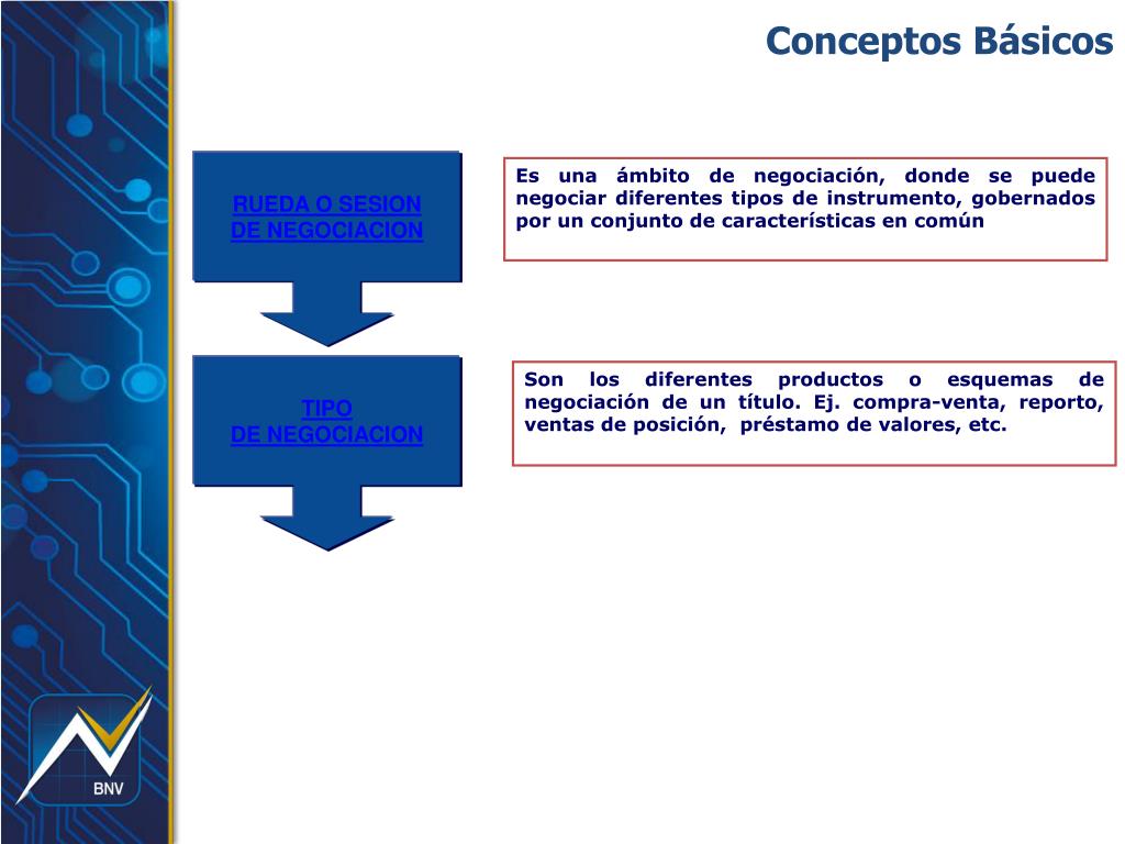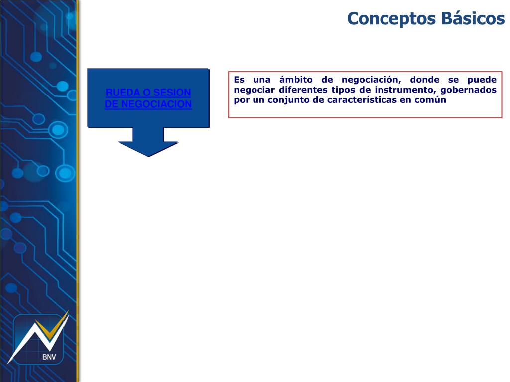 Conceptos Básicos RUEDA O SESION DE NEGOCIACION Es una ámbito de negociación, donde se puede negociar diferentes tipos de instrumento, gobernados por un conjunto de características en común 11