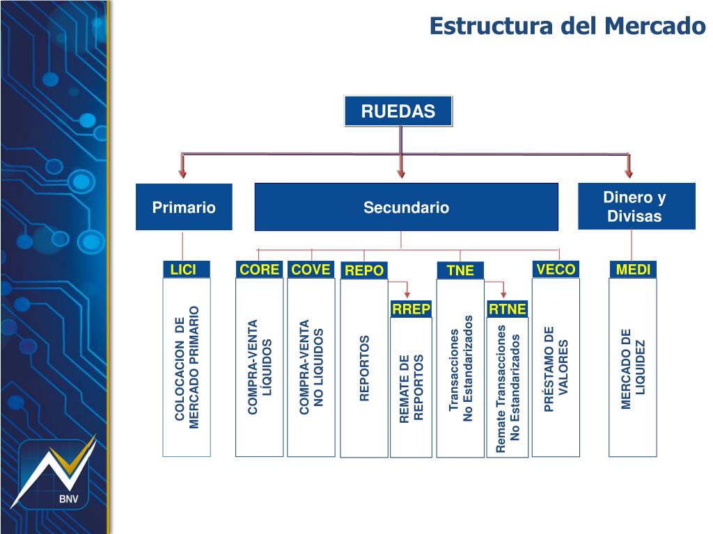 Estructura del Mercado RUEDAS Dinero y Divisas Primario Secundario VECO LICI CORE COVE MEDI REPO TNE RREP RTNE COLOCACION DE MERCADO PRIMARIO COMPRA-VENTA LÍQUIDOS COMPRA-VENTA NO LIQUIDOS PRÉSTAMO DE VALORES MERCADO DE LIQUIDEZ REPORTOS Transacciones No Estandarizados REMATE DE REPORTOS Remate Transacciones No Estandarizados