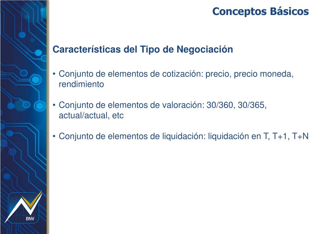 Conceptos Básicos • Características del Tipo de Negociación • Conjunto de elementos de cotización: precio, precio moneda, rendimiento • Conjunto de elementos de valoración: 30/360, 30/365, actual/actual, etc • Conjunto de elementos de liquidación: liquidación en T, T+1, T+N
