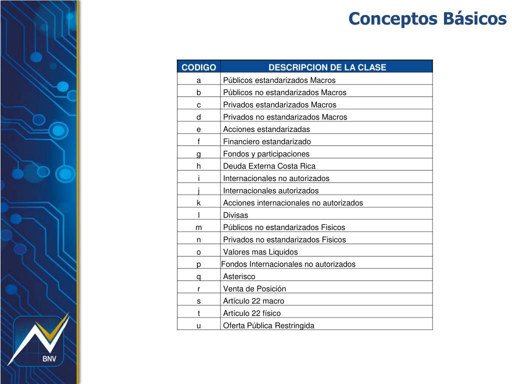 Conceptos Básicos • Ejemplos de Especies • Art22 con liquid.BPDC cdp 00BPDC0C22M2 s 01/10/2008 001 CRC • L/Estand/Precio BCCR bem BCCR060411AC a 06/04/2011 002 CRC • Ord.precio G bde14 USP3699PEM51 h 20/03/2004 001 USA • L/No estandarizado BCR cdp$ 00BCR00CJ653 s 26/08/2008 001 USA
